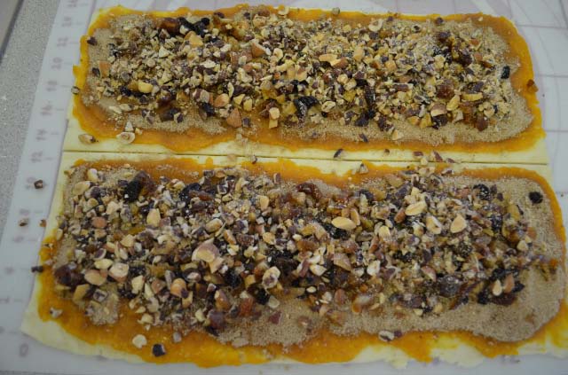 I worked on these for over a week.  Now that sounds like a long time, but I just did one task at a time on different days when I had a few spare moments.  I started by making the Apricot Lekvar.  I chose the apricot as opposed to the Prune option because I already had a bag of dried apricots on hand.  It was very easy to make and easily stored.  Next I worked on the nuts.  I used a mix of almonds, pecans, and hazelnuts.  I had to toast the pecan pieces that I had.  The almonds and hazelnuts that I had were already toasted.   After toasting,  I chopped all of them and measured them and stored them covered for several days as well.   Then I worked on the dried fruit.  I used Calimyrna figs, Medjool dates, and Crimson Raisins.  I pitted the dates and chopped the figs and raisins, then mixed them all together and added them to the growing ingredients.  Then when it came to the weekend I made the pastry dough in my Bosch mixer with my new cookie paddles that I ordered from Pleasant Hill Grain.  Then into the refrigerator for an overnight chill, well actually two nights because I didn’t get back to it until Sunday morning.  My original plan was to roll and fill the dough on Saturday night, but life intervened and that didn’t happen.  I was a bit apprehensive that I could get it all done on Sunday as the filled rolls needed to chill another four hours before baking.   I didn’t find it difficult to roll the dough out, but I did find it difficult to get the pastry rolled tight with all the wonderful filling ingredients stuffed inside.