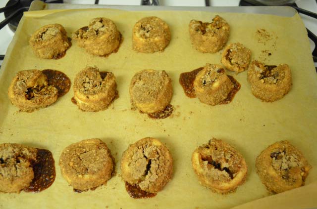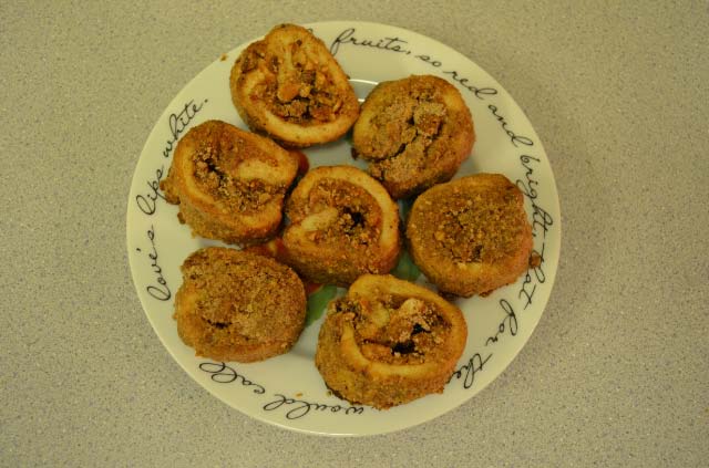 My first roll was too loose so when I cut and baked it quite of few of the pieces split open.  I found when cutting and baking the third roll , that if I submerged the cookie in the cinnamon sugar outside coating  and held it cupped between both hands and pressed it all together I had better luck with them staying rolled as they baked.  Falling apart during baking didn’t hurt the taste any, just the aesthetics.