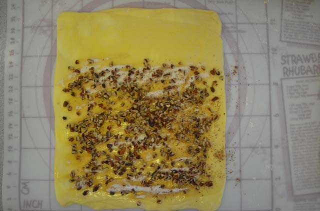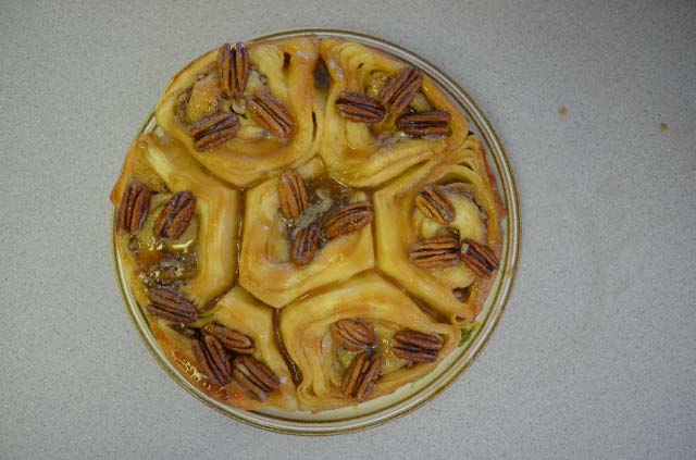 I love pecan sticky buns!  However, these are not your average sticky buns.  These buns were the assignment for this week’s  Tuesdays with Dorie.  They are made with brioche dough–a rich yeasted dough with eggs and lots of butter.  I worked on this over the course of 2 days as the dough needed a rest in the refrigerator over night.  I had never worked with laminated dough before and it wasn’t as difficult as I imagined.   Just many, many steps involved, rolling, adding butter, folding, chilling and rolling into a log, chilling.   Then, after slicing and putting in the pans, a 2 1/2 hour rise before baking.
