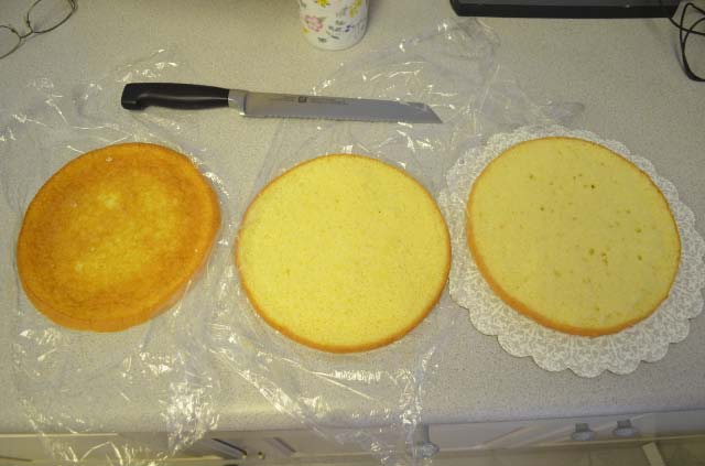 Actually, cutting it into layers went better than I thought it would.  I used the technique that I learned last year, that is to cut about and inch into the cake all the way around, measuring the height of the cut carefully.  Then you have a grove for your knife to follow as you cut through the entire layer.  It works like a charm and produces nice even layers.  The texture of the top two layers was quite nice, but as I said earlier, the bottom layer was tough.  It was still edible, but just not the nice texture that was in the top part of the cake.  Had I realized this while I was putting in the strawberry filling,  I would have added more juice to the bottom layer to soften it up a bit.